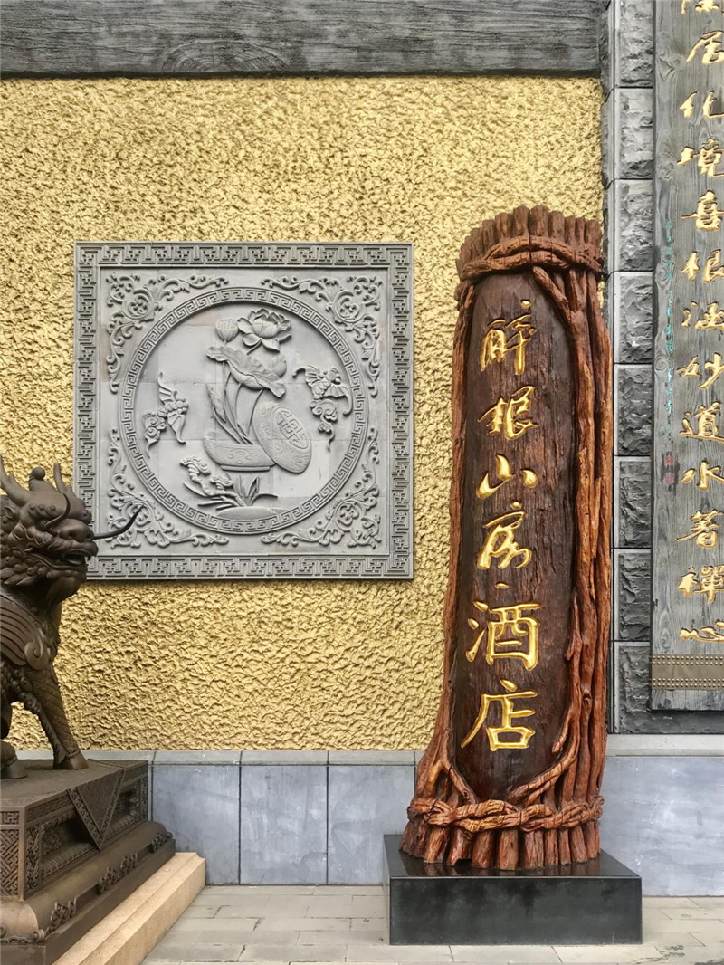 位于酒店门楼两侧,由东北松雕刻而成,二立柱巨大且均呈柴禾形状,正面书“醉根山房酒店”。“柴”与“财”谐音,“禾”与“火”谐音,寓意财源广进、生意红火。并以此祝愿来宾财如火旺、红红火火。