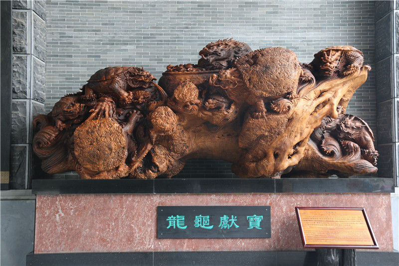 位于门楼左侧,楠木材质,龙龟为中国神话传说中的一种瑞兽,为“龙生九子”之一,又称“赑屃”。其头尾像龙,身体像龟。龙头有赐福之意,龟身有忍辱负重之品质。“龙龟”谐音“荣归”,有衣锦还乡、荣归故里之意。作品中有九只龙龟,又有“九九归一”之意,寓意从来处来,往去处去,又回到本初状态,是一种升华。既充满吉祥和合的气氛,又有回归本源的人生哲理。