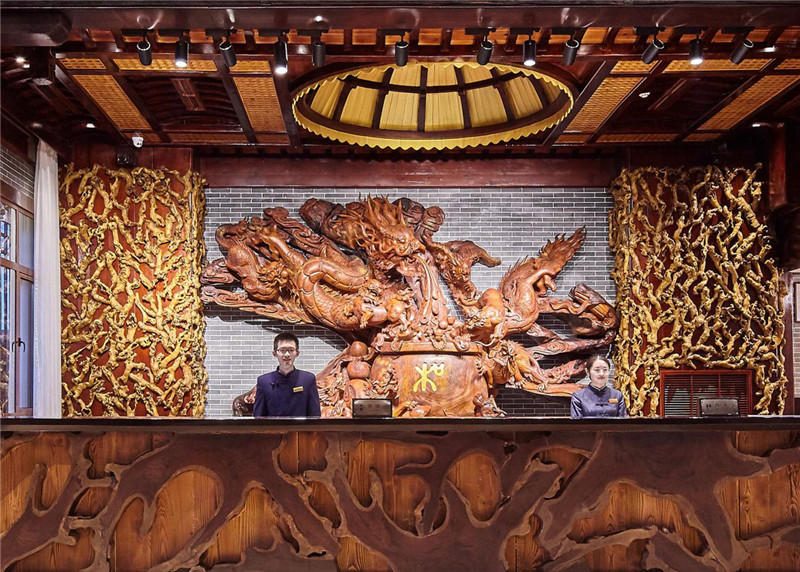 大型花梨木根雕作品,九龙献宝雕有九条龙,其突出部位雕一聚宝盆,龙嘴里源源不断的水流入聚宝盆,水入喻财进,寓意财富源源不断。聚宝盆上的“和”,寓和气生财,构思妙极。“龙生九子”意指人皆不同,各人心态亦不一,其行业、专业、分工不同,所处位置不同,那就要“和”,完美地体现“和为贵”与“和气生财”的理念。