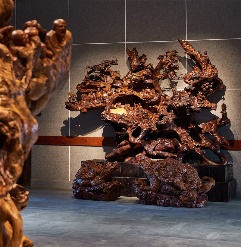 作品取珍贵千年缅甸红花梨根桩,以其莹润典雅之色调,衬托根的天然造型,又随形赋势,疏密有致地分布空间。众观音法相线条流畅,姿态各异,或潇洒自在、或跏趺而坐、或踏云而行。体态秀妍、内蕴沉静,法器各一,充满智慧与慈悲。将因机缘不同而示现不同化身之情景,与禅机妙理相融会,跃然眼前,极具禅意。