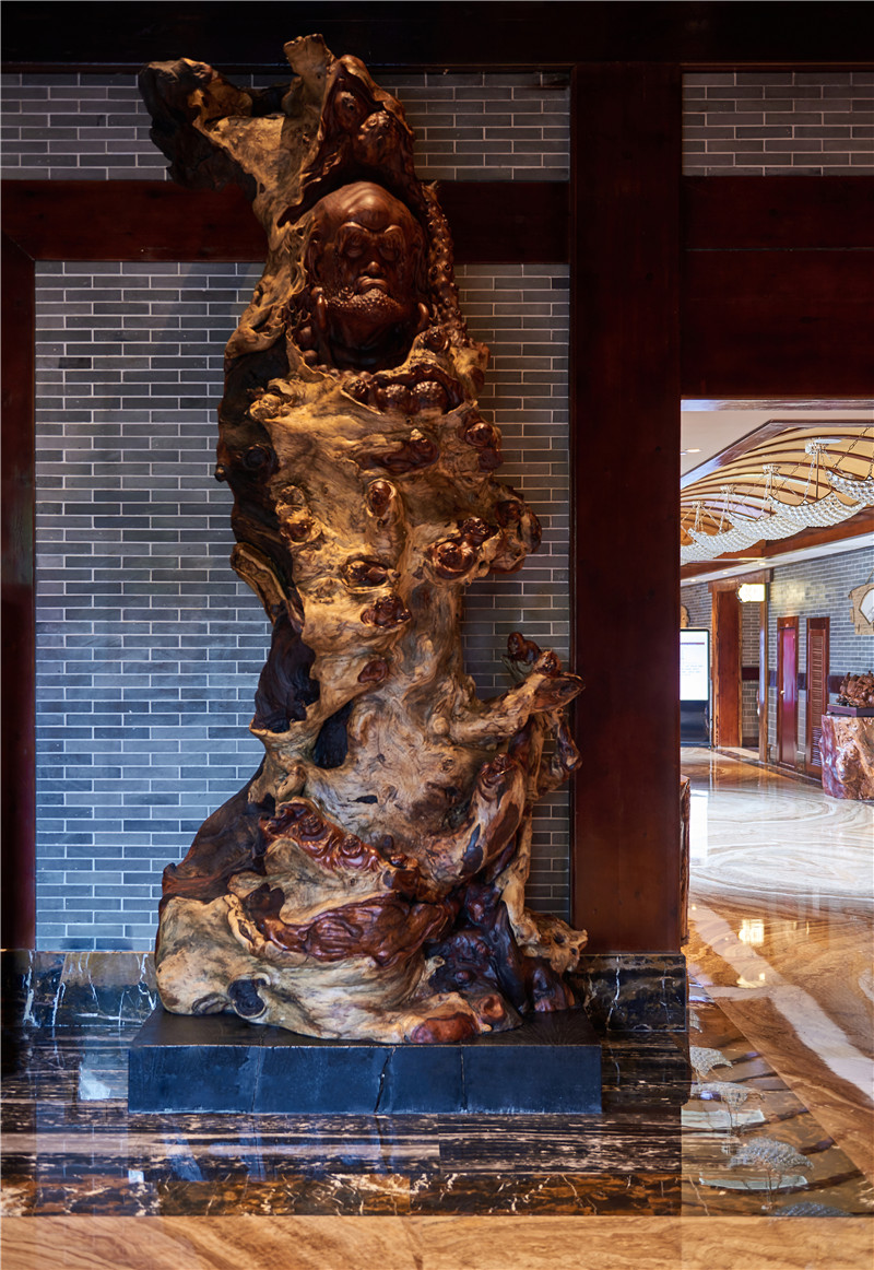 作品构思巧妙,匠心独运,随形就势而赋其意。但见达摩双目下视,四相不生,明心见性,如如不动。而根瘤处略施雕琢呈现而出的小童子,围拢于达摩祖师左右,情态逼真。他们或仰望微笑,或沉思聆听,仿佛都在跟着达摩参悟。一如芸芸众生,跟随祖师参悟。这恰与酒店的禅修养生相契合。