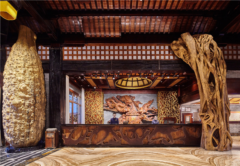 花瓶为橡胶木雕凿而成,其表面疏密相间的疙瘩延展开来,凸凹有致,富有立体感。中间粗壮外张,两端细而收拢,状如花瓶。高大挺立,寓意顶天立地。“瓶”与“平”谐音,寓意平平安安。