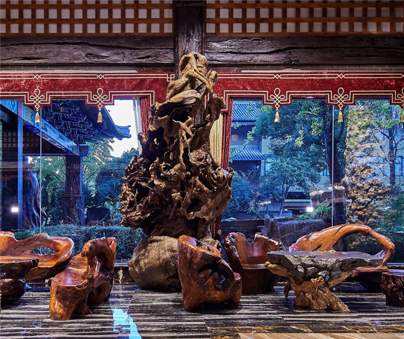 香樟根雕玉玲珑依自然造型,取意于上海豫园的同名太湖石,整件作品玲珑剔透,具漏、透、皱、瘦特点。置于大气磅礴酒店中,玲珑若现仙境,与酒店整体意境相吻合。